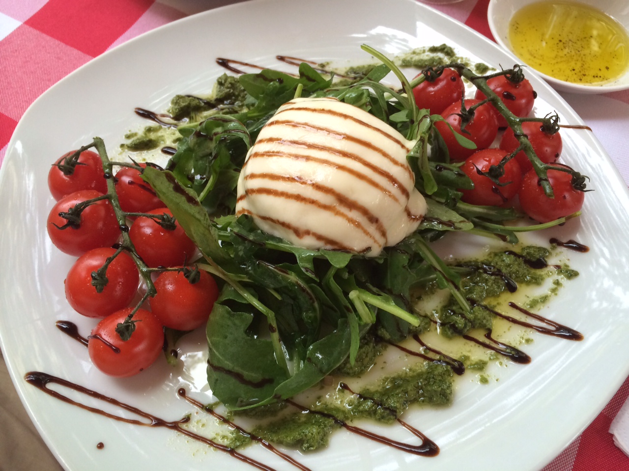 Zuerst lauwarme Büffelmozzarella auf Ruccola mit Cherrytomaten und raffiniertem Pesto. Da hatte man schon fast alles aus dem italienischen Garten auf dem Teller. Basilikum, Tomaten, Ruccola, Knoblauch. OK, die Mozzarella war vom fiktiven Bauern neben an. Hätte ich es nicht besser gewusst, ich hätte mich in Italien gewähnt.