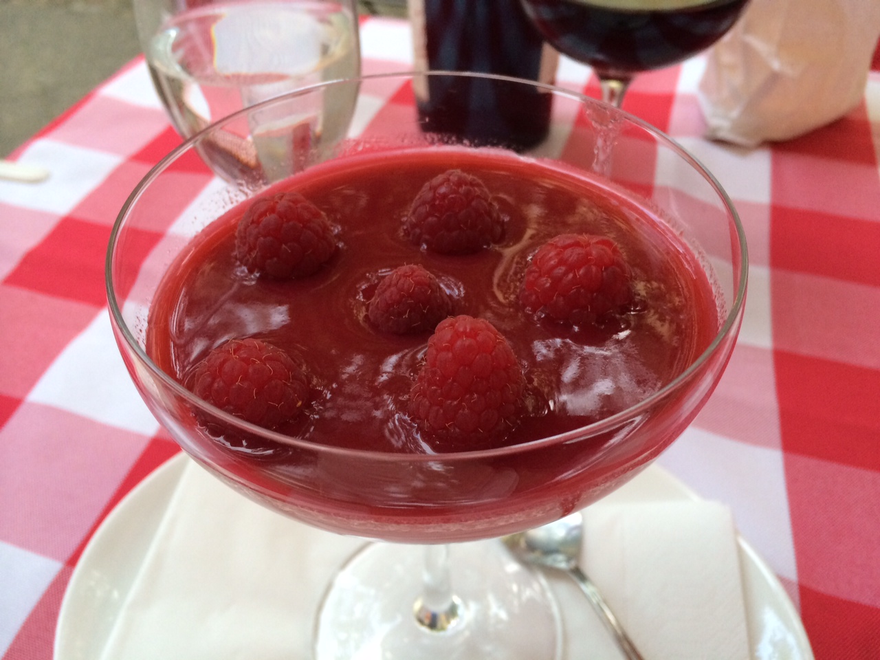 Platz hatte es eigentlich nicht mehr. Trotzdem überredete mich Luciano Paparotto noch zu einem kleinen Dessert. Ein cremiges Panna Cotta mit einer Himbersauce und frischen Himbeeren krönten den tollen Abend im Mamma Monti.