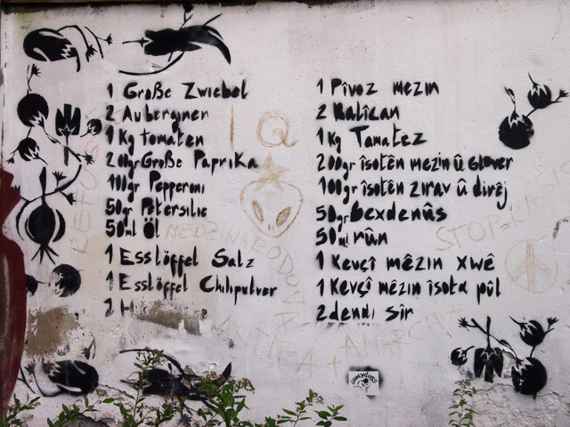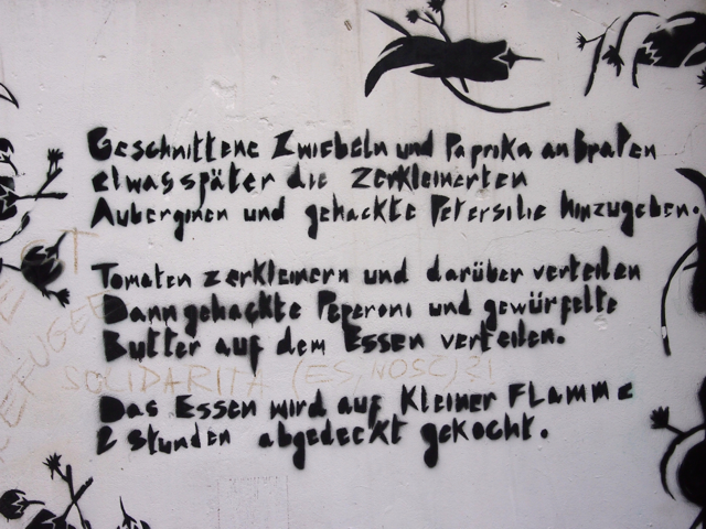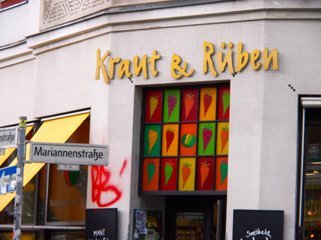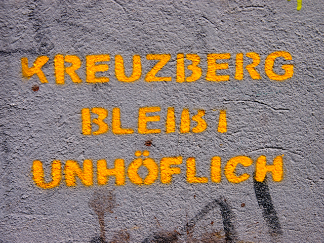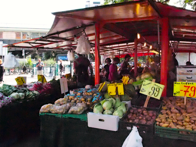 Ich hatte eine private Führerin, da sich sonst niemand für die Tour angemeldet hatte. Somit war ich der Chef und die Tour verlief entsprechend meinem Gusto. Der Start war am Kottbusser Tor, wo Kreuzberger Alltagsleben auf bunte Kiezkultur trifft. Ein türkischer Markt, arabische Restaurants und Bistros, schicke Cafés sowie alternative Clubs und Bars säumen den Platz, der von der Hochbahn der berühmten Linie 1 geteilt wird. Spannend zu erfahren, wie sich die Kreuzberger organisieren um z.B. steigenden Mieten zu begegnen. Aber wild war das also noch nicht. Gut, es hatte Türken, aber die waren freundlich und friedlich. Und das Gemüse am Markt sah sensationell knackig aus.
